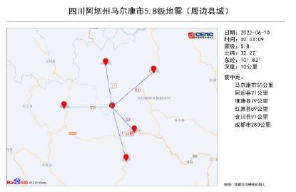 中國地震臺網正式測定:06月10日01時28分在四川阿壩州馬爾康市發生5.8級地震,震源深度13千米。